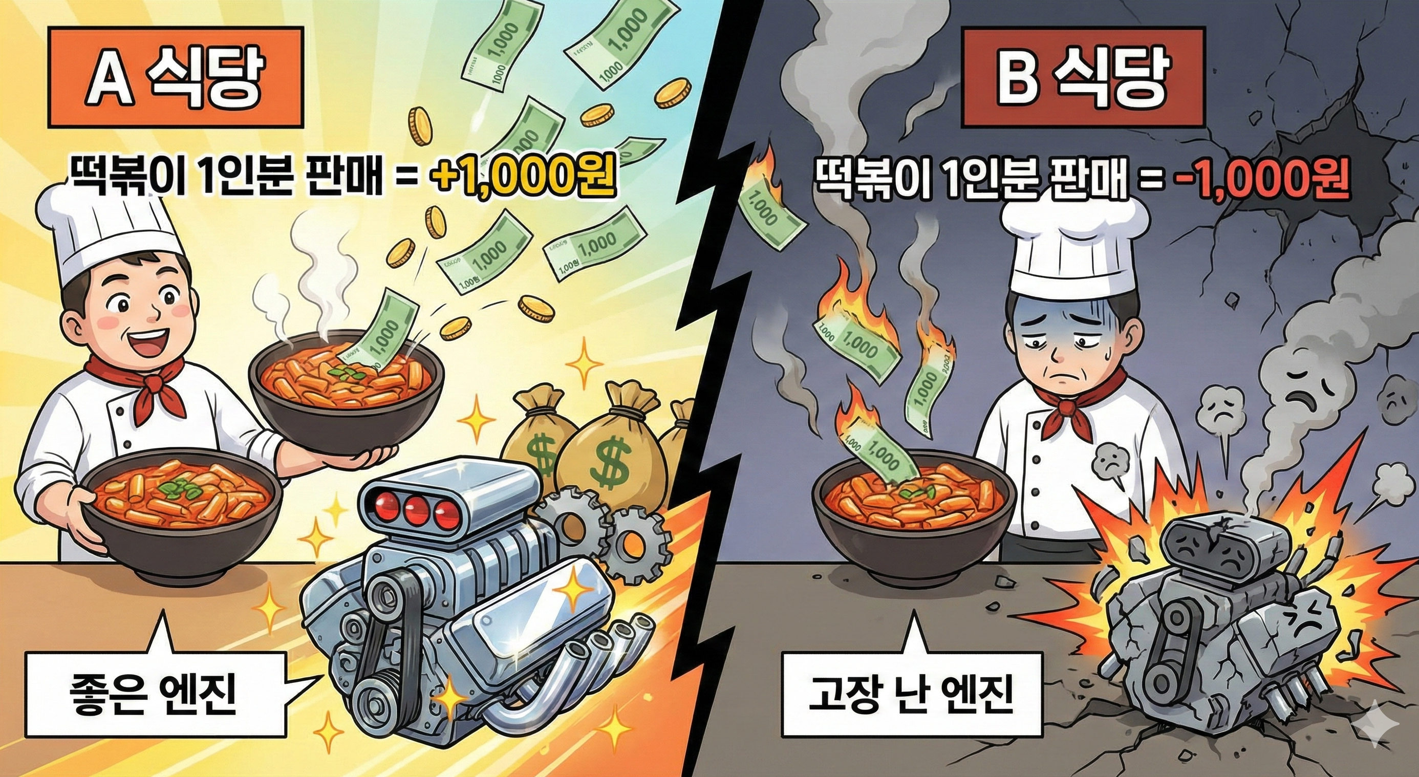 - B 식당 : 떡볶이 1인분을 팔면 1,000원 손해를 봅니다. (고장 난 엔진)